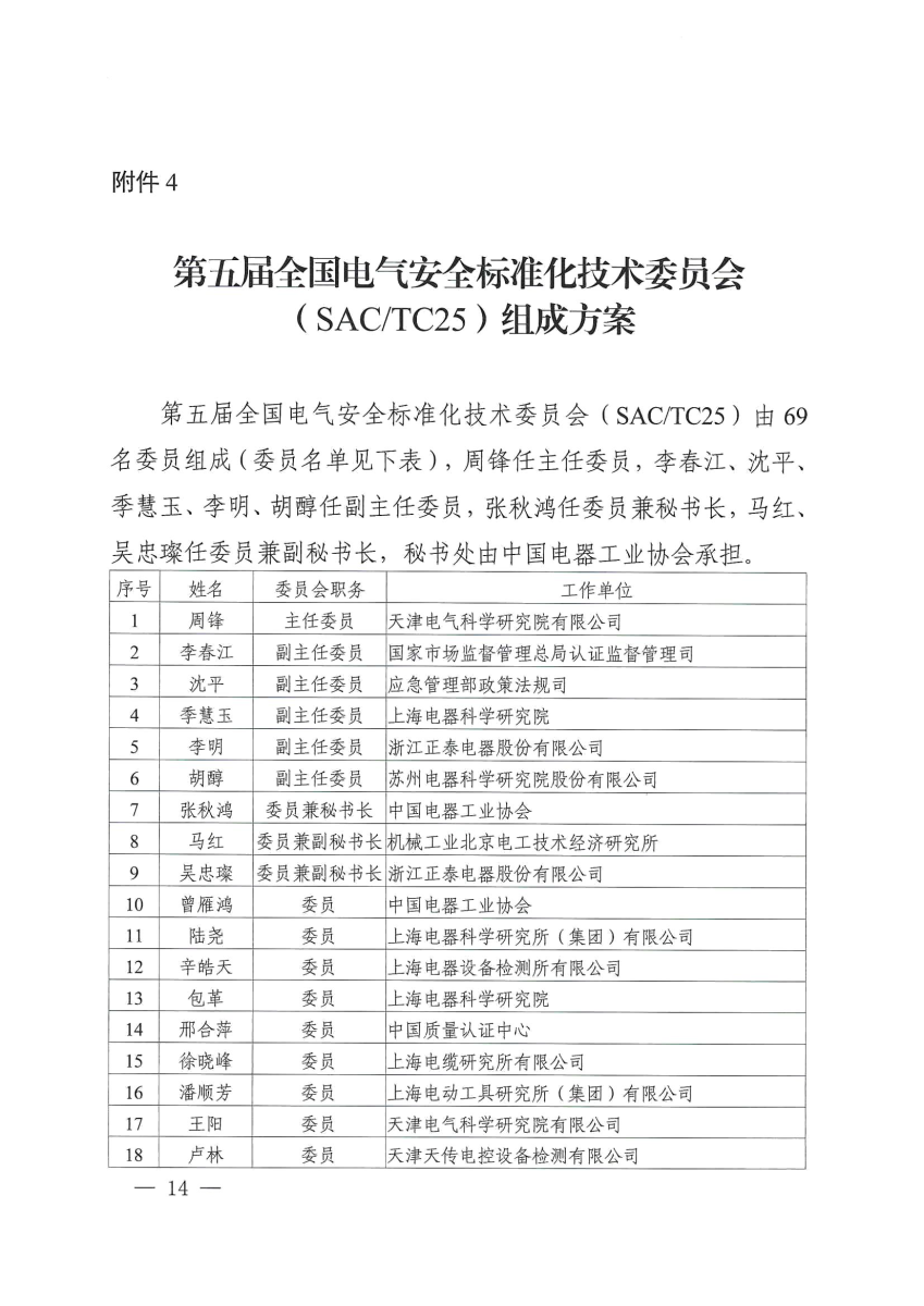 第五屆全國電氣安全標(biāo)準(zhǔn)化技術(shù)委員會(SAC/TC25)任期5年,由69名委員組成,秘書處由中國電器工業(yè)協(xié)會承擔(dān)。