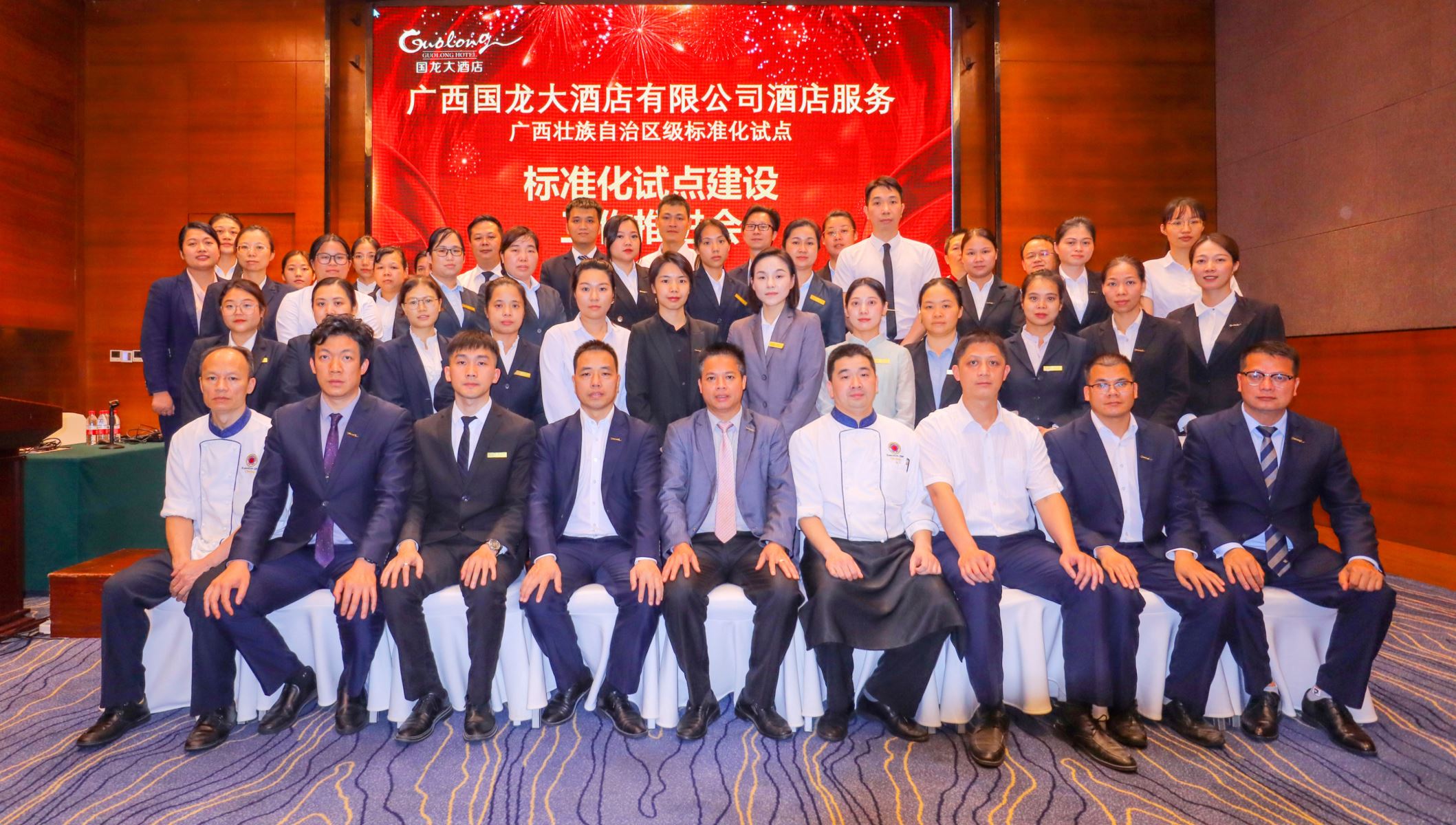 黃美玲經(jīng)理宣布標準化方針與目標,明確了領(lǐng)導小組、工作小組成員和職責,任命專兼職標準化團隊。林志康主管宣讀《廣西國龍大酒店有限公司酒店服務標準化試點實施方案》,麥斯達夫標準化張惠棋匯報當前工作情況并進行標準化基礎(chǔ)知識及試點建設(shè)流程培訓。培訓結(jié)束后召開座談會,安排布置了下一步的重點工作。