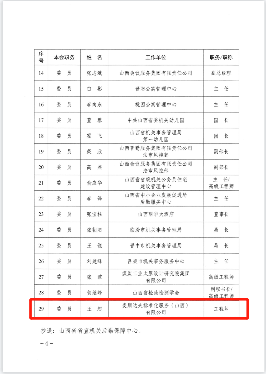 2023年7月3日,根據(jù)《山西省市場(chǎng)監(jiān)督管理局關(guān)于同意山西省機(jī)關(guān)運(yùn)行保障管理標(biāo)準(zhǔn)化技術(shù)委員會(huì)秘書處承擔(dān)單位及委員調(diào)整的復(fù)函》,麥斯達(dá)夫標(biāo)準(zhǔn)化首席運(yùn)營官王超當(dāng)選山西省機(jī)關(guān)運(yùn)行保障管理標(biāo)準(zhǔn)化技術(shù)委員會(huì)委員。