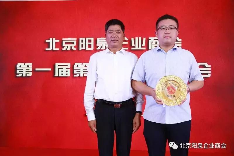 張益智會長為新當(dāng)選的商會副會長鄭波(右)頒發(fā)銅牌
