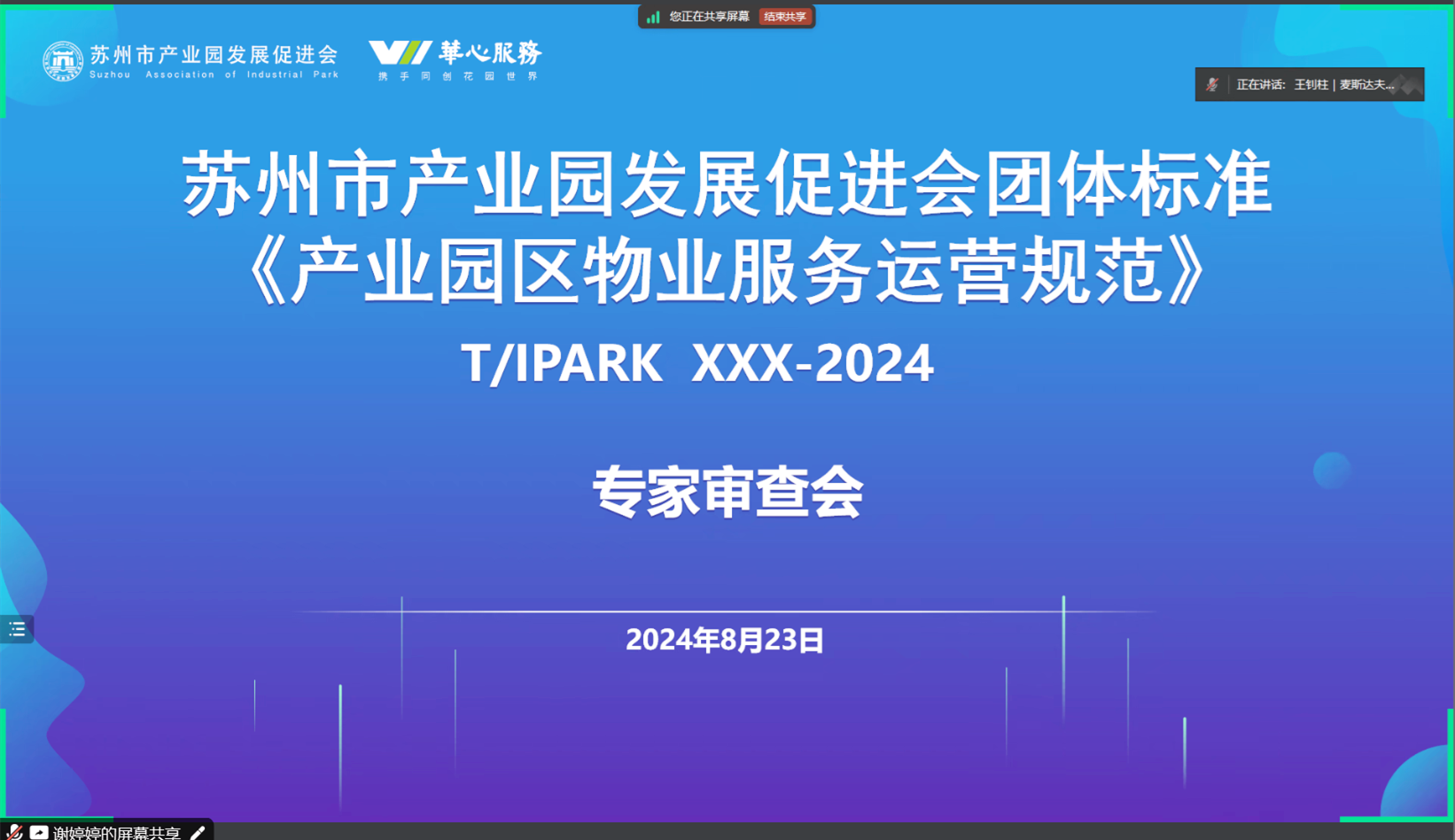 2024年8月23日,由蘇州市產業(yè)園發(fā)展促進會歸口、蘇州華新國際物業(yè)管理有限公司主導編制的《產業(yè)園區(qū)物業(yè)服務運營規(guī)范》團體標準專家審查會以線上會議形式召開。來自蘇州市市場監(jiān)督管理局、中國標準化研究院、江蘇省質量和標準化研究院、全國物業(yè)服務標準化技術委員會、招商局積余產業(yè)運營服務股份有限公司的五位專家組成標準審查專家組。蘇州華心科技服務集團副總裁鄒一敏、品質運營中心副總經理崔秋菊、產服中心產品經理劉浩、發(fā)展中心發(fā)展經理張敬,蘇州市產業(yè)園發(fā)展促進會招商信息處處長王濤出席會議。會議由麥斯達夫標準化市場總監(jiān)、蘇州公司總經理王釗柱主持。