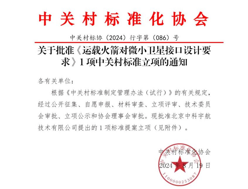 2024年8月19日,由北京中科宇航技術(shù)有限公司牽頭的中關(guān)村標(biāo)準(zhǔn)《運載火箭對微小衛(wèi)星接口設(shè)計要求》正式獲批立項。