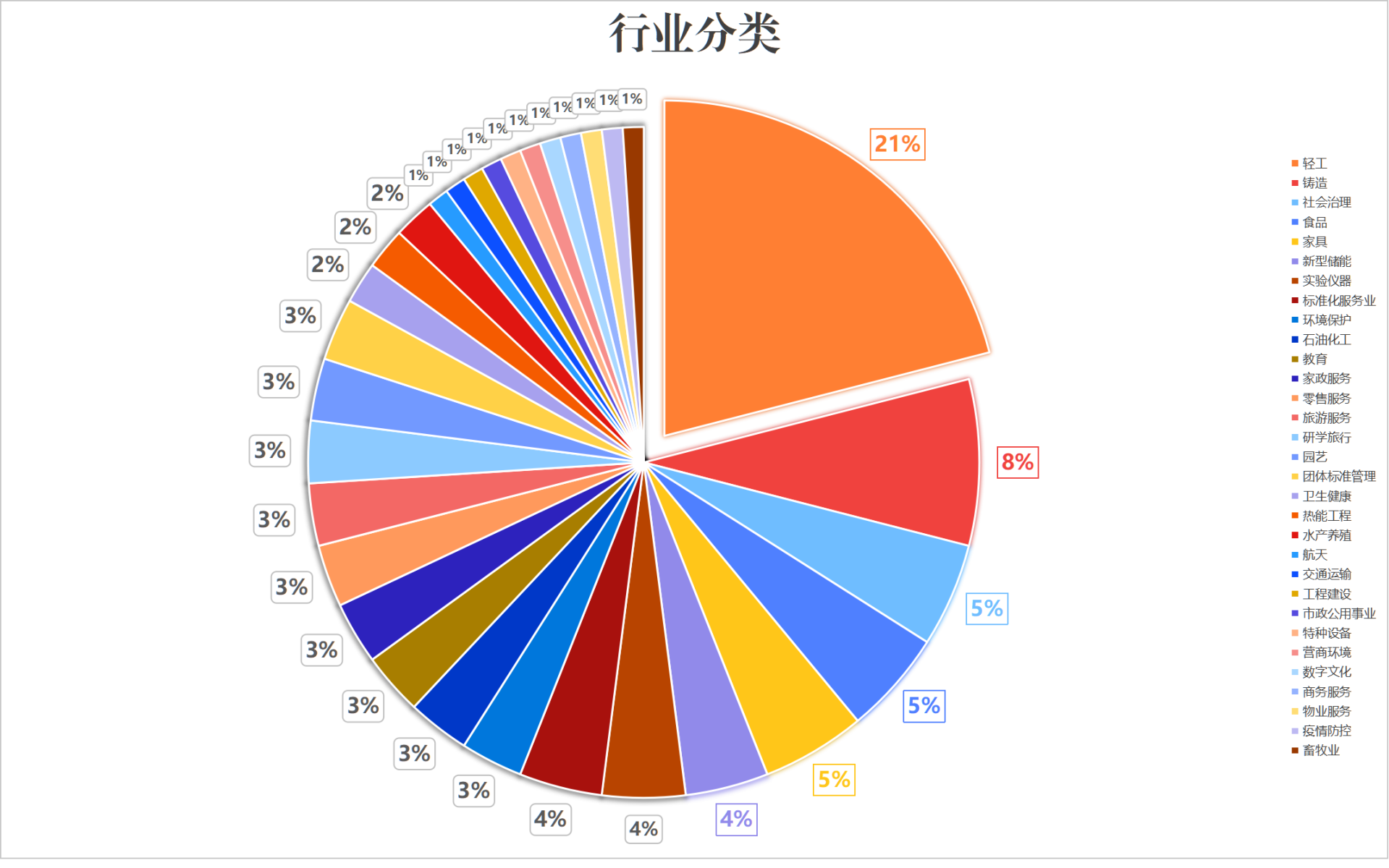 從行業(yè)角度來(lái)看,涉及了31個(gè)行業(yè),分別為輕工21項(xiàng),占比21%;鑄造8項(xiàng),占比8%;社會(huì)治理、食品、家具分別為5項(xiàng),占比5%;新型儲(chǔ)能、實(shí)驗(yàn)儀器、標(biāo)準(zhǔn)化服務(wù)業(yè)分別為4項(xiàng),占比4%;環(huán)境保護(hù)、石油化工、教育、家政服務(wù)、零售服務(wù)、旅游服務(wù)、研學(xué)旅行、園藝、團(tuán)體標(biāo)準(zhǔn)管理分別為3項(xiàng),分別占比3%;衛(wèi)生健康、熱能工程、水產(chǎn)養(yǎng)殖分別為2項(xiàng),分別占比2%;航天、交通運(yùn)輸、工程建設(shè)、市政公用事業(yè)、特種設(shè)備、營(yíng)商環(huán)境、數(shù)字文化、商務(wù)服務(wù)、物業(yè)服務(wù)、疫情防控、畜牧業(yè)分別為1項(xiàng),分別占1%。