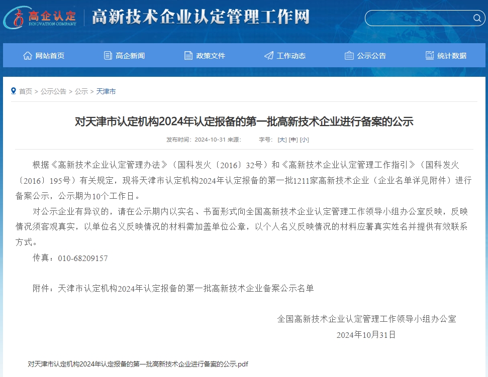 根據(jù)《高新技術(shù)企業(yè)認(rèn)定管理辦法》(國科發(fā)火〔2016〕32號)和《高新技術(shù)企業(yè)認(rèn)定管理工作指引》(國科發(fā)火〔2016〕195號)有關(guān)規(guī)定,天津市認(rèn)定機(jī)構(gòu)2024年認(rèn)定報備的第一批1211家高新技術(shù)企業(yè)名單于2024年10月31日公示。天津麥斯達(dá)夫標(biāo)準(zhǔn)化服務(wù)有限公司榮耀位列其中,繼北京總部、深圳公司、廣州公司之后,成為麥斯達(dá)夫集團(tuán)第四家國家高新技術(shù)企業(yè)。