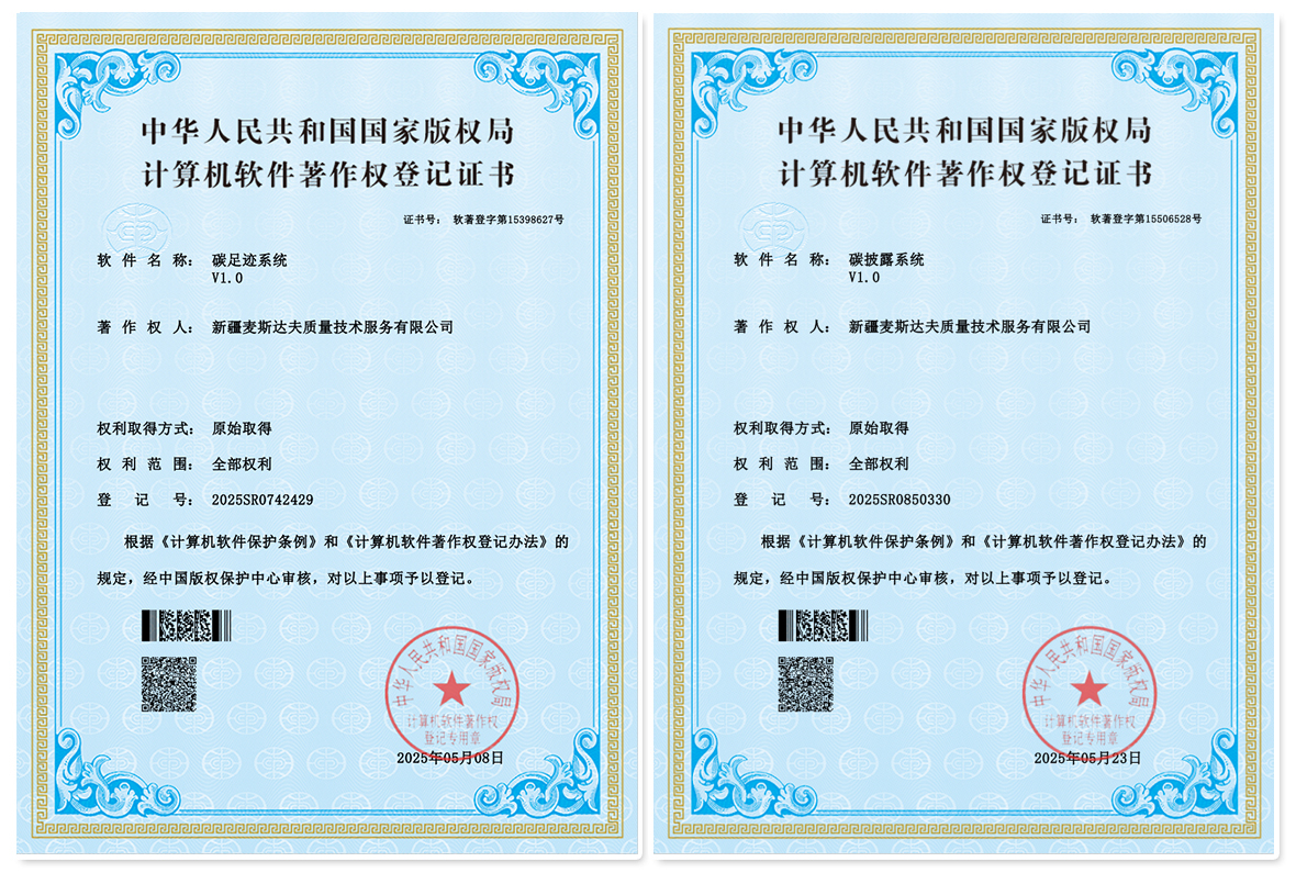 2025年4-5月,新疆麥斯達夫質量技術服務有限公司先后獲批“碳監(jiān)測系統V1.0”“碳分析系統V1.0”“碳計量系統V1.0”“碳交易系統V1.0”“碳足跡系統V1.0”“碳披露系統V1.0”等六項雙碳領域軟件著作權,實現雙碳技術服務全鏈條知識產權完整布局。