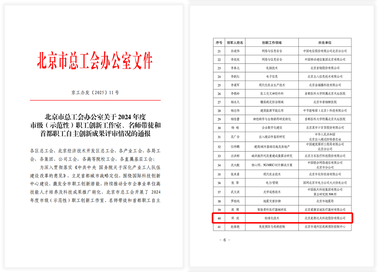 2025年5月,北京市總工會發(fā)布《北京市總工會辦公室關于2024年度市級(示范性)職工創(chuàng)新工作室、名師帶徒和首都職工自主創(chuàng)新成果評審情況的通報》(京工辦發(fā)〔2025〕11號)。經推薦申報、專家評審、實地查驗等環(huán)節(jié),北京麥斯達夫科技股份有限公司被評為2024年度市級職工創(chuàng)新工作室。