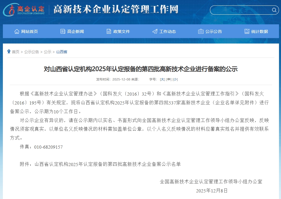 根據(jù)《高新技術(shù)企業(yè)認(rèn)定管理辦法》(國科發(fā)火〔2016〕32號(hào))和《高新技術(shù)企業(yè)認(rèn)定管理工作指引》(國科發(fā)火〔2016〕195號(hào))有關(guān)規(guī)定,山西省認(rèn)定機(jī)構(gòu)2025年認(rèn)定報(bào)備的第四批537家高新技術(shù)企業(yè)名單于2025年12月8日公示。麥斯達(dá)夫(山西)集團(tuán)有限公司榮耀位列其中,繼北京總部、深圳公司、廣州公司、天津公司之后,成為麥斯達(dá)夫集團(tuán)旗下第五家國家高新技術(shù)企業(yè)。