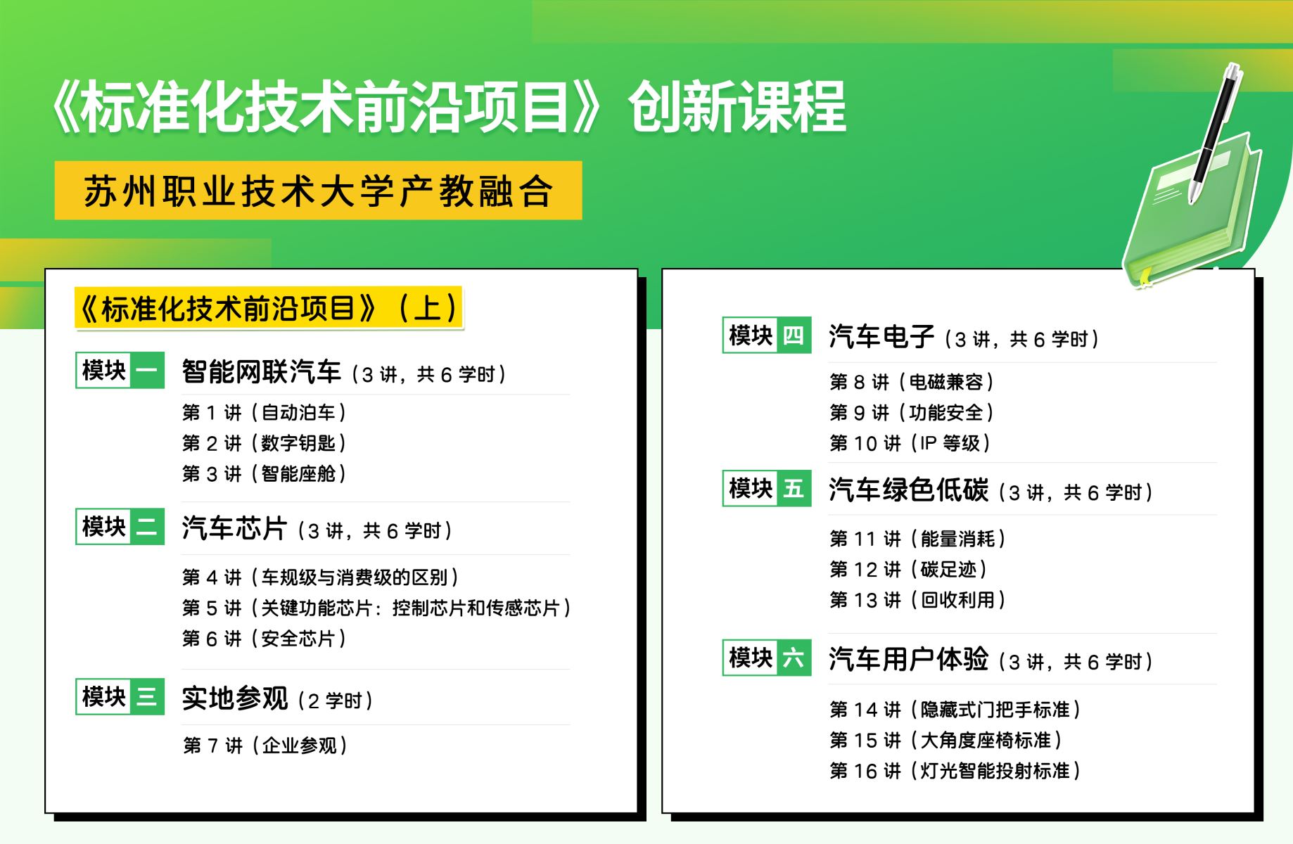 《標準化技術前沿項目》課程共設32講、64課時,自本學期起正式納入蘇州職業(yè)技術大學機電工程學院“汽車標準化技術”微專業(yè)核心課程體系。麥斯達夫集團全面負責課程的教學實施,包括授課師資配備、課件教材開發(fā)、實訓教具準備、課程標準制定、課后習題組編、線上微課錄制和考核體系設計等環(huán)節(jié),全方位保障課程質量和教學效果。
