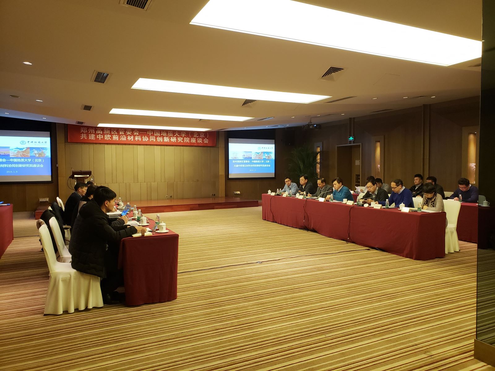 2019年1月9日,“鄭州市高新區(qū)管委會(huì)—中國(guó)地質(zhì)大學(xué)(北京)”共建中歐前沿材料協(xié)同創(chuàng)新研究院座談會(huì)在京召開(kāi)。鄭州高新區(qū)黨工委書(shū)記、管委會(huì)主任王新亭,改革開(kāi)放領(lǐng)導(dǎo)小組副組長(zhǎng)兼辦公室主任鄭彥松、投資促進(jìn)中心主任張煒煒、黨政辦公室副主任魯華雨、投資促進(jìn)中心副主任王楨等赴京參加會(huì)議,中國(guó)地質(zhì)大學(xué)(北京)副校長(zhǎng)萬(wàn)力、校長(zhǎng)助理兼發(fā)展規(guī)劃處處長(zhǎng)于光、科技處處長(zhǎng)趙志丹、珠寶學(xué)院黨委副書(shū)記周彥、科技處副處長(zhǎng)楊曉剛,工程技術(shù)學(xué)院副院長(zhǎng)岳文、王成彪教授等出席會(huì)議,麥斯達(dá)夫首席執(zhí)行官鄭波、高級(jí)副總裁李鵬、鄭州公司總經(jīng)理李寧等參加活動(dòng)。