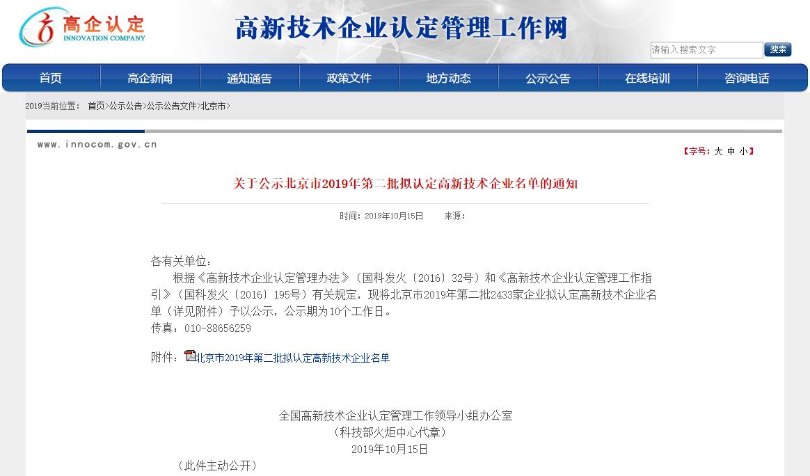 根據(jù)《高新技術(shù)企業(yè)認定管理辦法》(國科發(fā)火〔2016〕32號)和《高新技術(shù)企業(yè)認定管理工作指引》(國科發(fā)火〔2016〕195號)有關(guān)規(guī)定,北京市2019年第二批2433家企業(yè)擬認定高新技術(shù)企業(yè)名單于2019年10月15日公示。北京麥斯達夫科技有限公司榮耀位列其中。