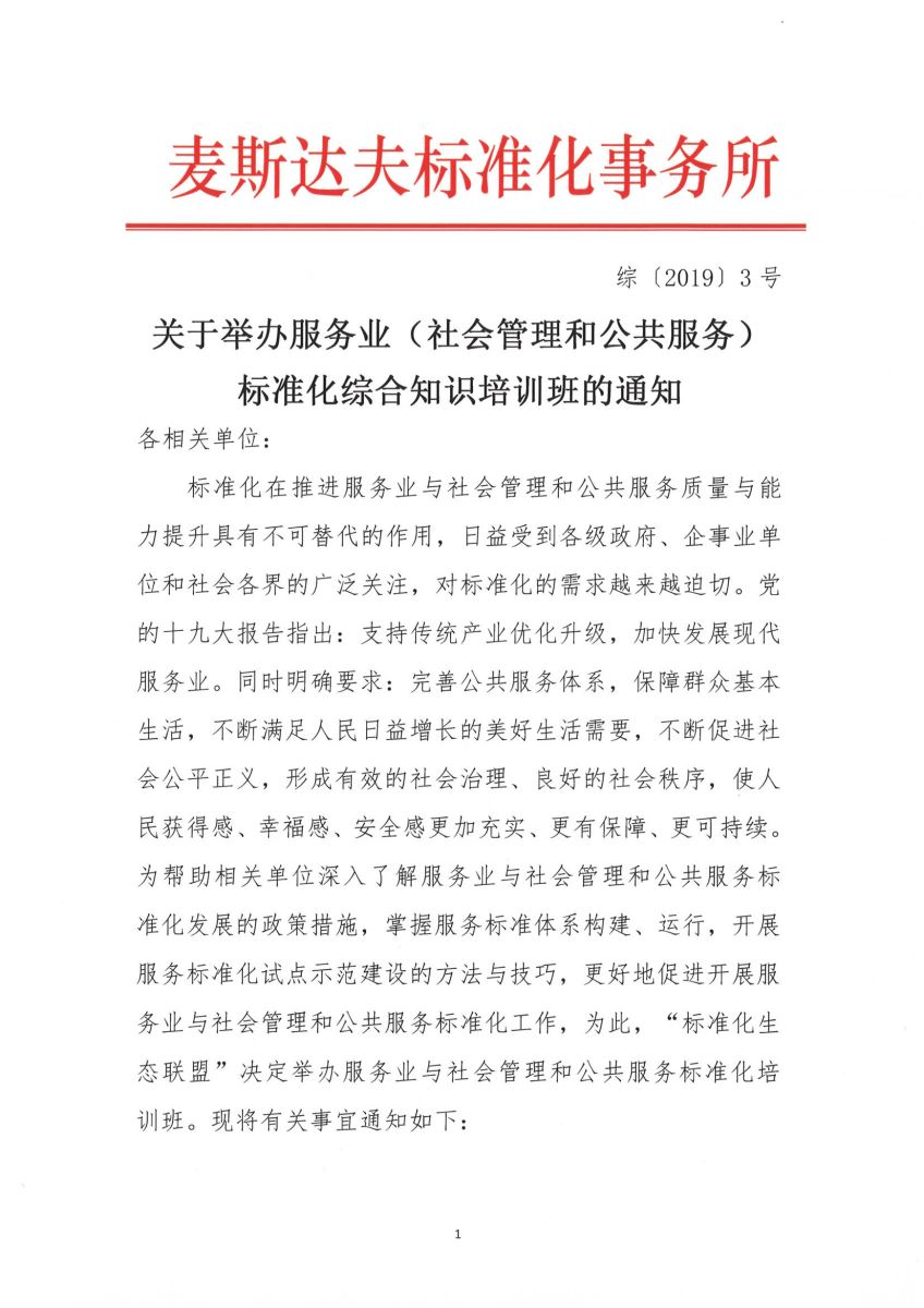 關(guān)于舉辦服務(wù)業(yè)(社會(huì)管理和公共服務(wù))標(biāo)準(zhǔn)化綜合知識(shí)培訓(xùn)班的通知