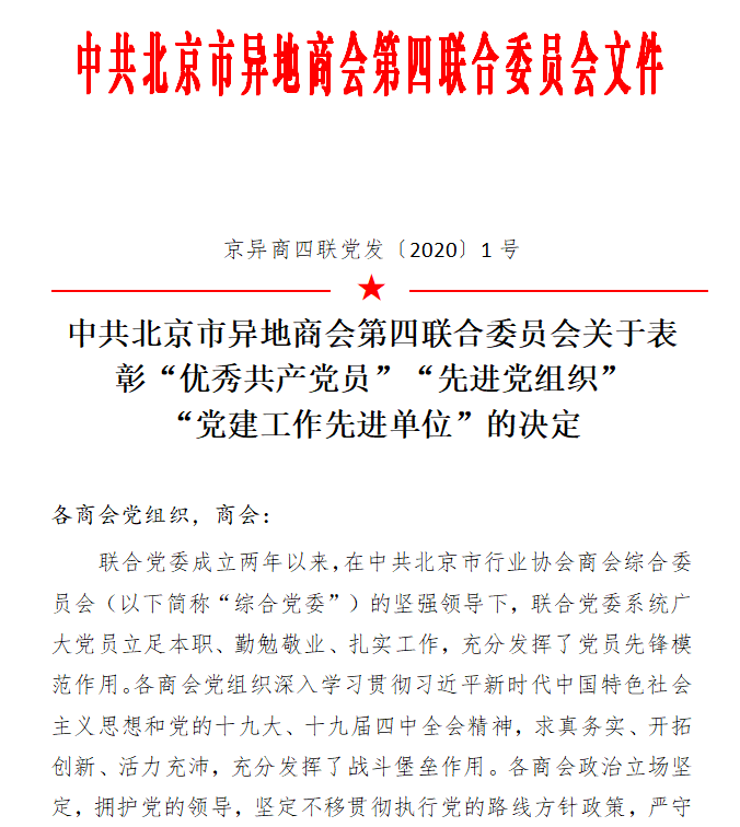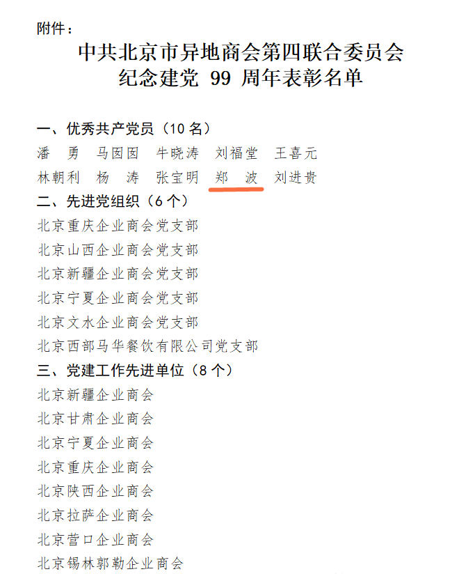根據(jù)中共北京市異地商會(huì)第四聯(lián)合委員會(huì)紀(jì)念建黨99周年表彰工作總體安排,嚴(yán)格按照相關(guān)程序進(jìn)行評(píng)選,授予潘勇等10名同志“優(yōu)秀共產(chǎn)黨員”榮譽(yù)稱號(hào),授予中共北京重慶企業(yè)商會(huì)黨支部等6個(gè)黨組織“先進(jìn)黨組織”榮譽(yù)稱號(hào),授予北京新疆企業(yè)商會(huì)等8家社會(huì)組織“黨建工作先進(jìn)單位”榮譽(yù)稱號(hào)。北京陽(yáng)泉企業(yè)商會(huì)副會(huì)長(zhǎng)、中共北京麥斯達(dá)夫科技有限公司黨支部書記鄭波榮獲“優(yōu)秀共產(chǎn)黨員”稱號(hào)。