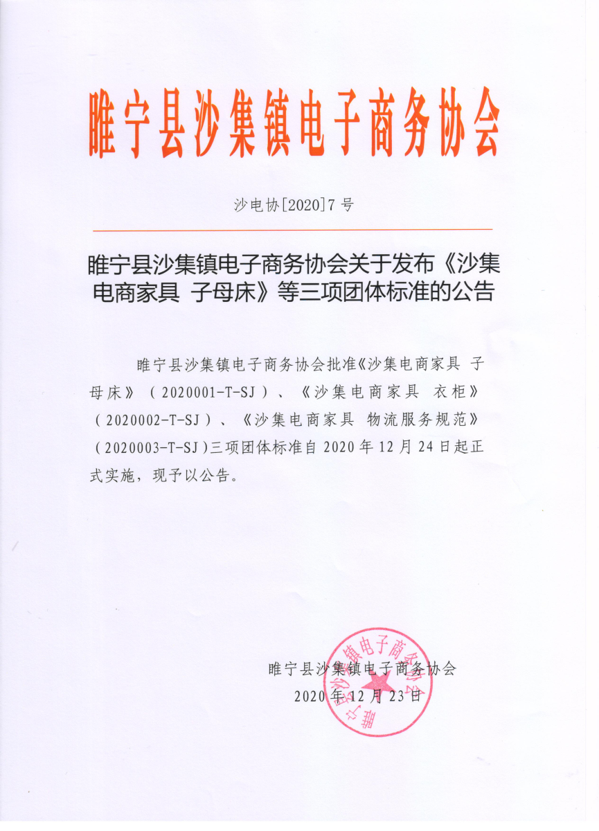 2020年12月23日,由麥斯達夫標準化事務所主導編制的《沙集電商家具 子母床》(2020001-T-SJ)、《沙集電商家具 衣柜》(2020002-T-SJ)、《沙集電商家具 物流服務規(guī)范》(2020003-T-SJ)三項團體標準正式獲批發(fā)布。