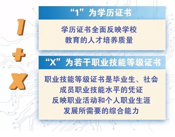 《國務(wù)院關(guān)于印發(fā)國家職業(yè)教育改革實(shí)施方案的通知》(國發(fā)〔2019〕4號)中指出,“深化復(fù)合型技術(shù)技能人才培養(yǎng)培訓(xùn)模式改革,借鑒國際職業(yè)教育培訓(xùn)普遍做法,制訂工作方案和具體管理辦法,啟動1+X證書制度試點(diǎn)工作。試點(diǎn)工作要進(jìn)一步發(fā)揮好學(xué)歷證書作用,夯實(shí)學(xué)生可持續(xù)發(fā)展基礎(chǔ),鼓勵職業(yè)院校學(xué)生在獲得學(xué)歷證書的同時,積極取得多類職業(yè)技能等級證書,拓展就業(yè)創(chuàng)業(yè)本領(lǐng),緩解結(jié)構(gòu)性就業(yè)矛盾。國務(wù)院人力資源社會保障行政部門、教育行政部門在職責(zé)范圍內(nèi),分別負(fù)責(zé)管理監(jiān)督考核院校外、院校內(nèi)職業(yè)技能等級證書的實(shí)施(技工院校內(nèi)由人力資源社會保障行政部門負(fù)責(zé)),國務(wù)院人力資源社會保障行政部門組織制定職業(yè)標(biāo)準(zhǔn),國務(wù)院教育行政部門依照職業(yè)標(biāo)準(zhǔn)牽頭組織開發(fā)教學(xué)等相關(guān)標(biāo)準(zhǔn)。院校內(nèi)培訓(xùn)可面向社會人群,院校外培訓(xùn)也可面向在校學(xué)生。各類職業(yè)技能等級證書具有同等效力,持有證書人員享受同等待遇。院校內(nèi)實(shí)施的職業(yè)技能等級證書分為初級、中級、高級,是職業(yè)技能水平的憑證,反映職業(yè)活動和個人職業(yè)生涯發(fā)展所需要的綜合能力。”