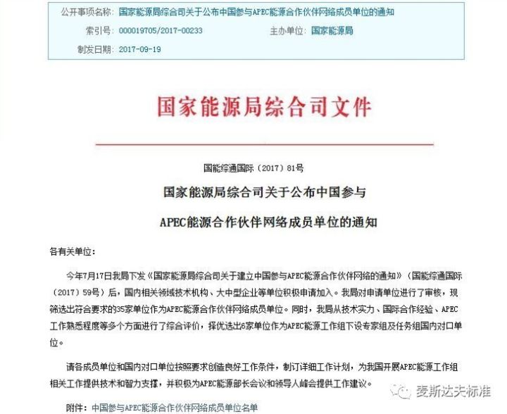 2017年9月19日,國家能源局下發(fā)《國家能源局綜合司關于建立中國參與APEC能源合作伙伴網(wǎng)絡的通知》(國能綜通國際〔2017〕59號),公布了通過篩選審核的35家APEC能源合作伙伴網(wǎng)絡成員單位。北京麥斯達夫公司赫然在列。