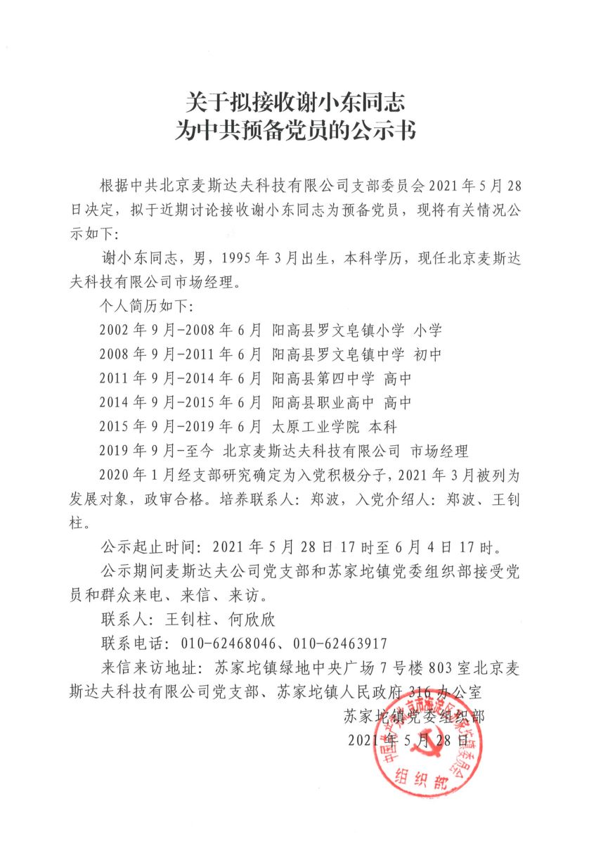 根據(jù)中共北京麥斯達夫科技有限公司支部委員會2021年5月28日決定,擬于近期討論接收謝小東同志為預備黨員,現(xiàn)將有關情況公示如下:
