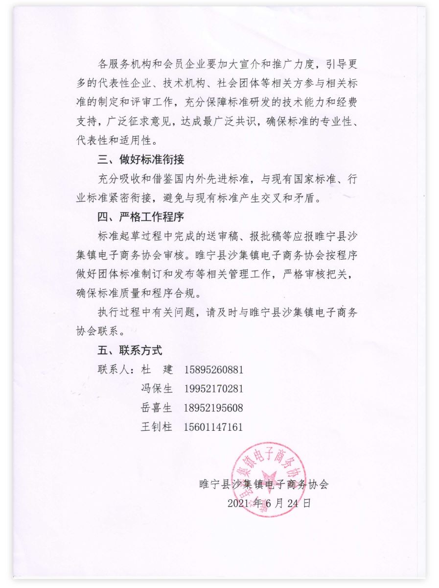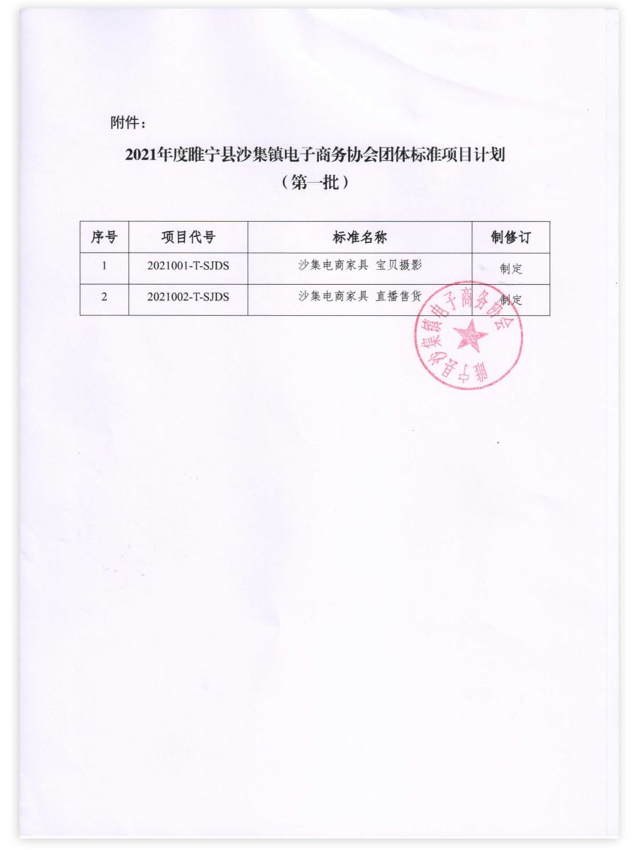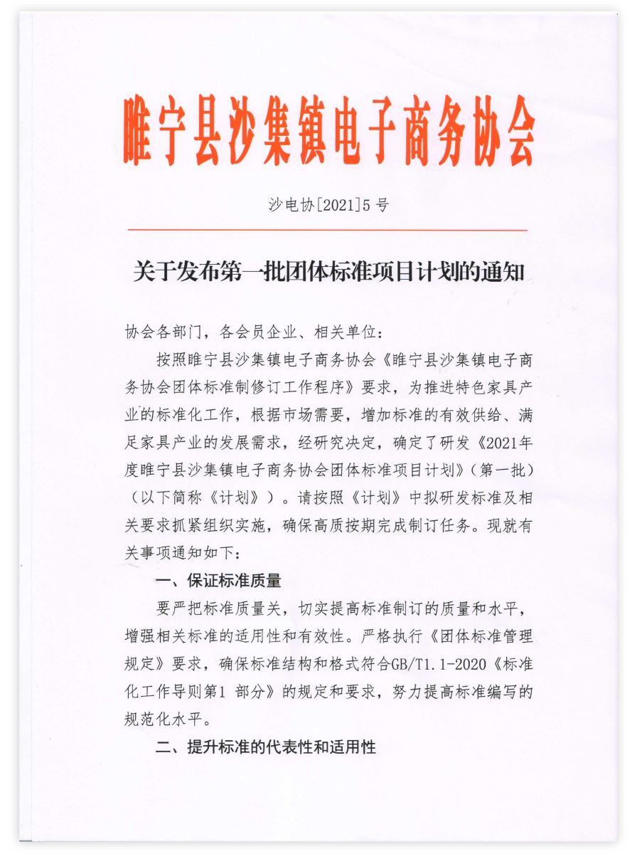 2021年6月24日,《沙集電商家具 寶貝攝影》《沙集電商家具 直播售貨》兩項團體標準正式在睢寧縣沙集鎮(zhèn)電子商務(wù)協(xié)會立項。