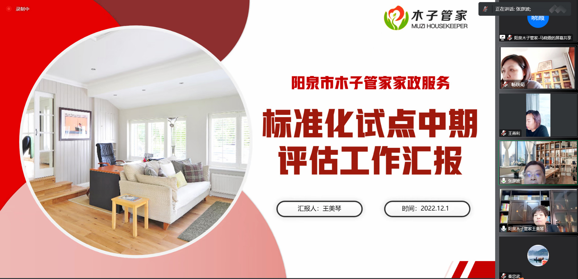 2022年12月1日,陽泉市木子管家家政服務(wù)標(biāo)準(zhǔn)化試點中期驗收評估會以網(wǎng)絡(luò)會議形式召開。山西省市場監(jiān)督管理局標(biāo)準(zhǔn)管理處處長王守業(yè)、二級調(diào)研員秦忠武帶隊,來自山西省社會科學(xué)院、山西省檢驗檢測中心、中國(山西)知識產(chǎn)權(quán)保護中心、山西省標(biāo)準(zhǔn)計量技術(shù)研究院等單位的專家組成評估專家組。陽泉市市場監(jiān)督管理局副局長劉建民、標(biāo)準(zhǔn)化協(xié)調(diào)推進科科長劉淑嫻、標(biāo)準(zhǔn)管理科科長傅江出席會議,陽泉木子管家家政服務(wù)有限公司總經(jīng)理王美琴參加會議并作試點建設(shè)匯報。