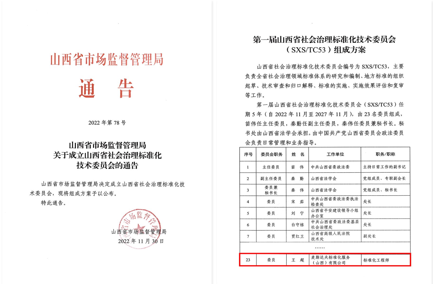 2022年11月30日,山西省市場監(jiān)督管理局決定成立山西省社會治理標(biāo)準(zhǔn)化技術(shù)委員會,并公布了組成方案。麥斯達(dá)夫標(biāo)準(zhǔn)化首席運營官王超當(dāng)選第一屆山西省社會治理標(biāo)準(zhǔn)化技術(shù)委員會委員。