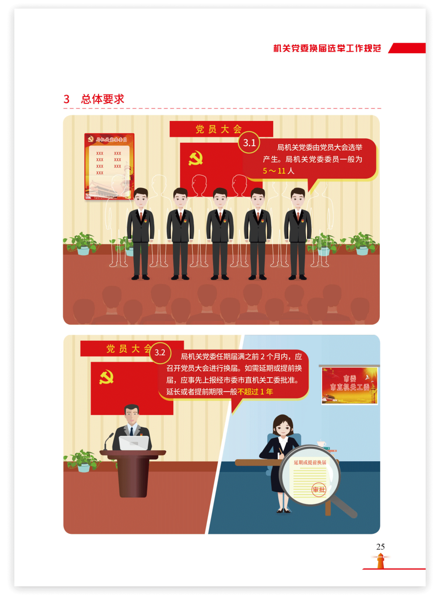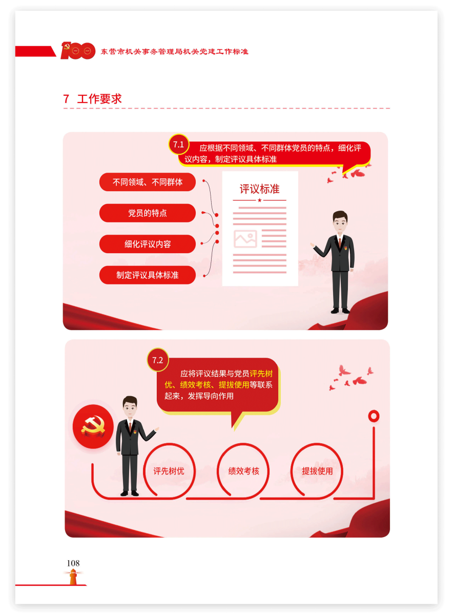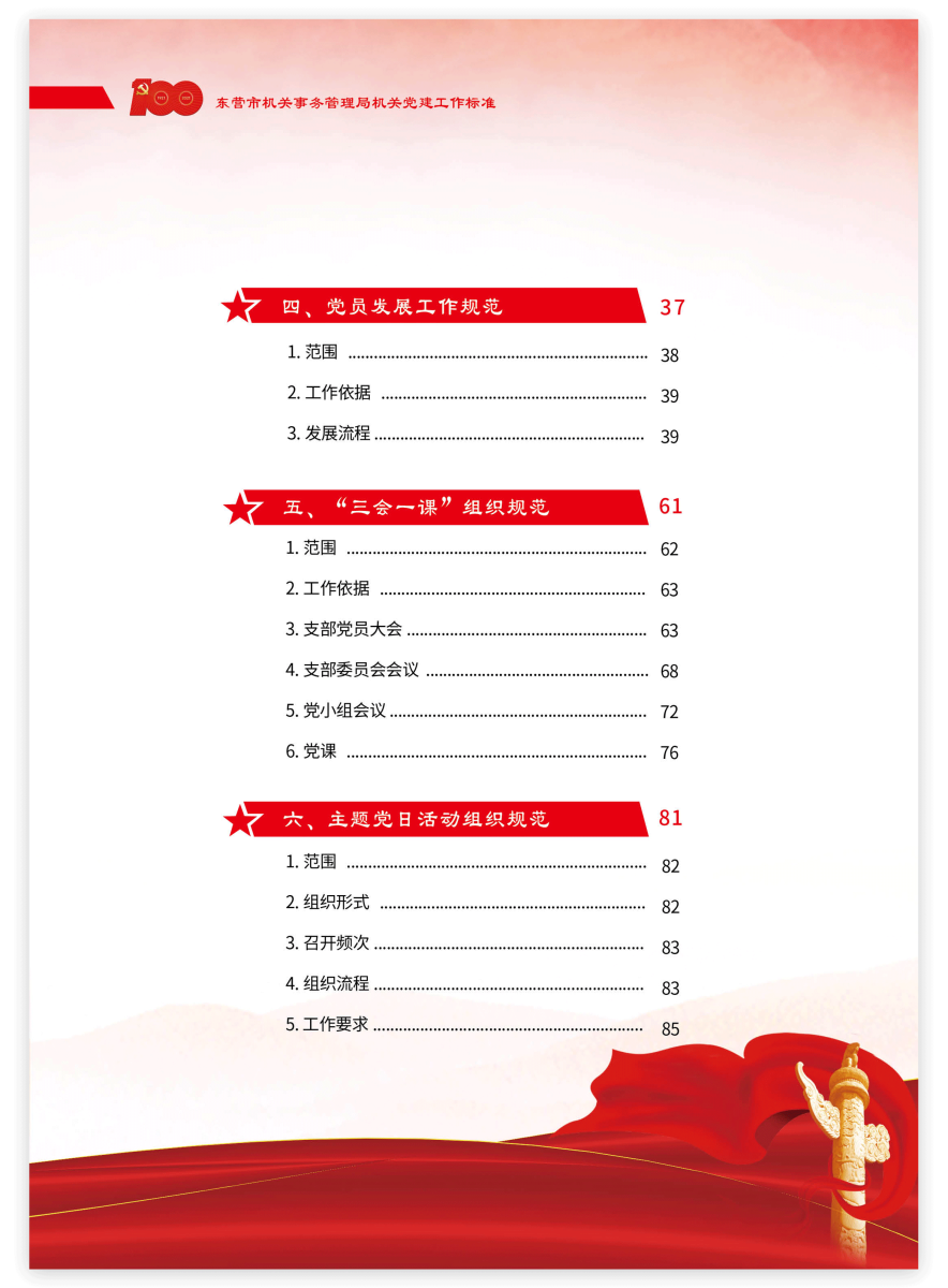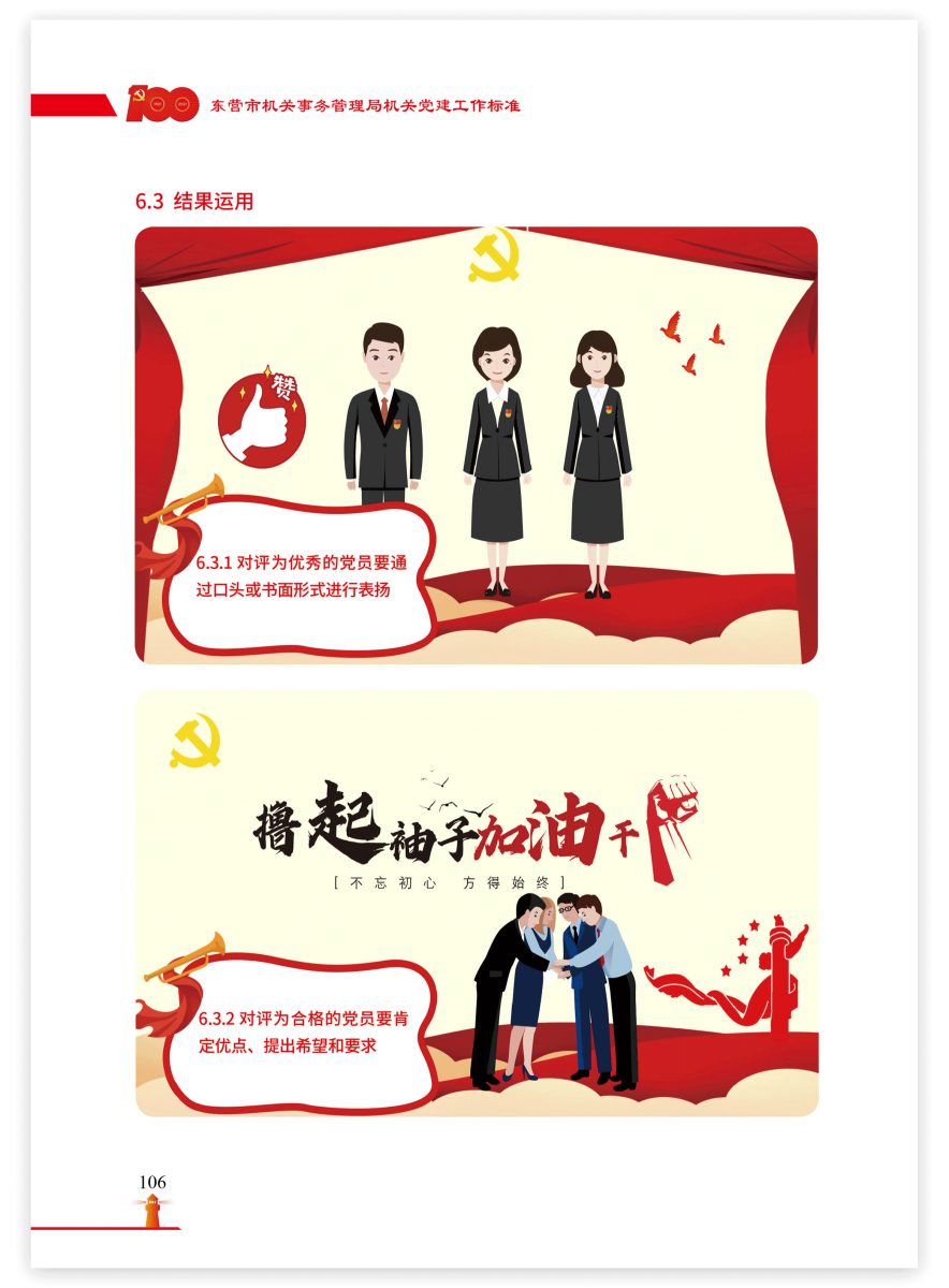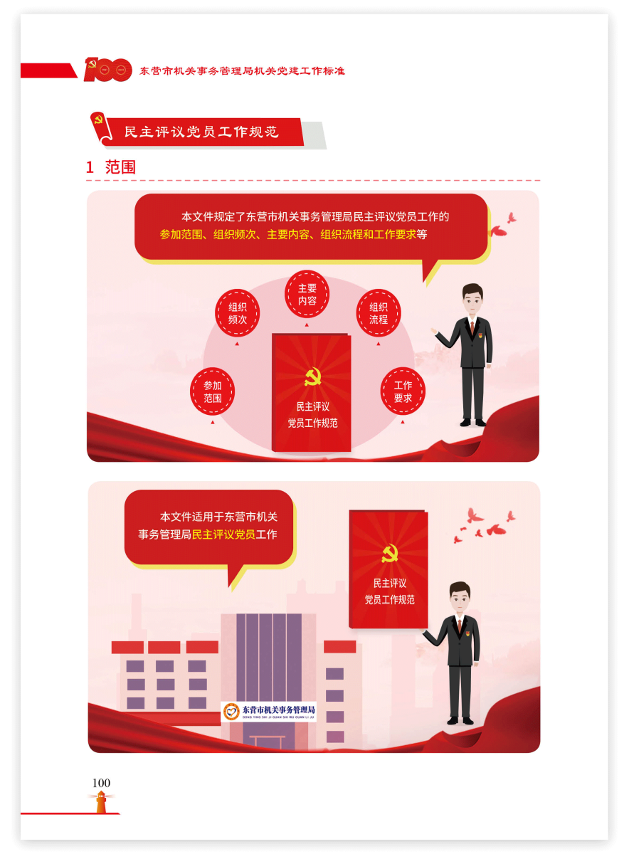 《東營市機關事務管理局機關黨建工作標準》(圖解版)系統(tǒng)梳理了機關黨建工作的規(guī)章制度,把機關黨建工作的內容、要求、流程都以標準的形式固定下來。全書涵蓋了黨組理論學習中心組學習、黨組織書記抓基層黨建述職評議考核、機關黨建換屆選舉、黨員發(fā)展、“三會一課”、主題黨日活動、組織生活會、民主評議黨員、“身邊的榜樣”選樹等九個方面的工作,既包含了機關黨建的規(guī)定動作,也在黨建工作與業(yè)務工作融合上進行了初步探索,供黨建工作者學習參考。全書以“標準圖解版”的形式呈現(xiàn),一共繪制了242張圖片,每一個場景、每一個細小元素均經過精心設計。