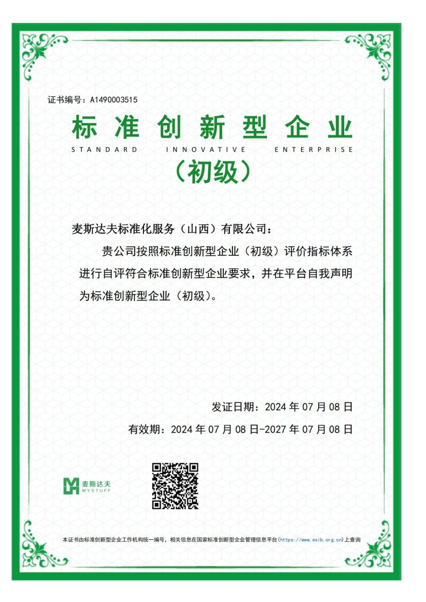 麥斯達(dá)夫標(biāo)準(zhǔn)化服務(wù)(山西)有限公司獲評(píng)標(biāo)準(zhǔn)創(chuàng)新型企業(yè)