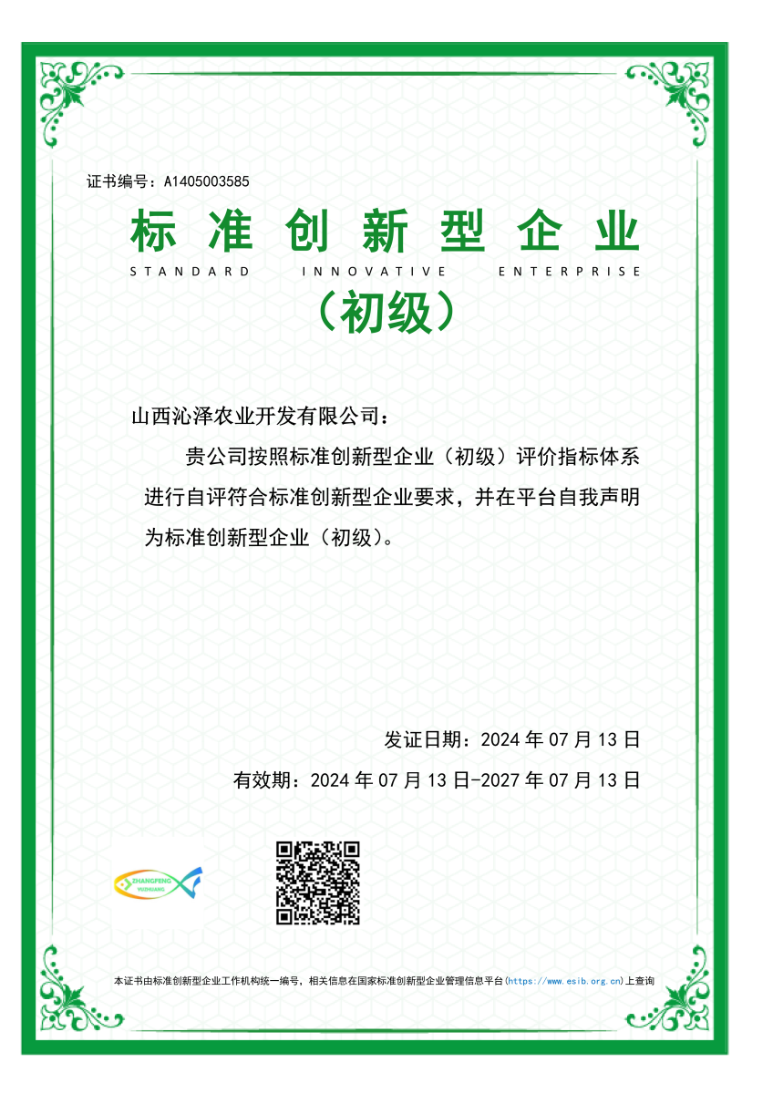山西沁澤農(nóng)業(yè)開發(fā)有限公司獲評標(biāo)準(zhǔn)創(chuàng)新型企業(yè)