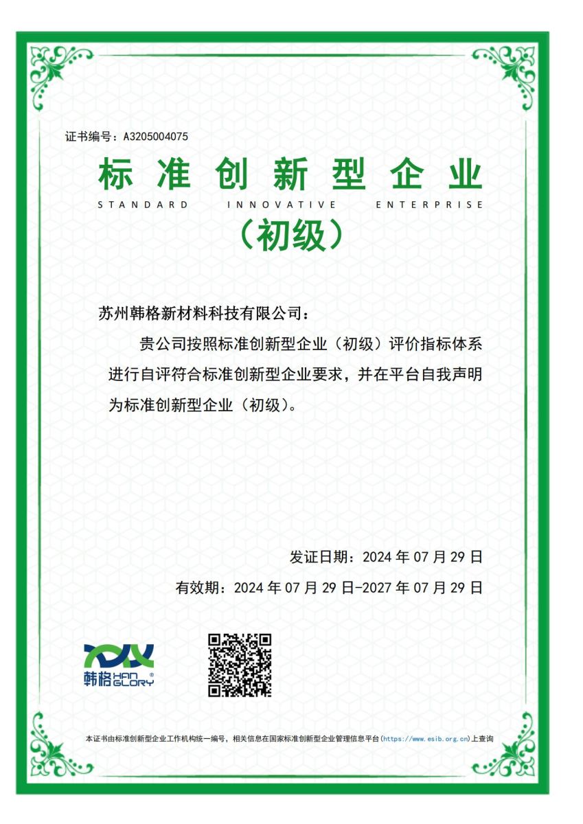蘇州韓格新材料科技有限公司獲評標(biāo)準(zhǔn)創(chuàng)新型企業(yè)